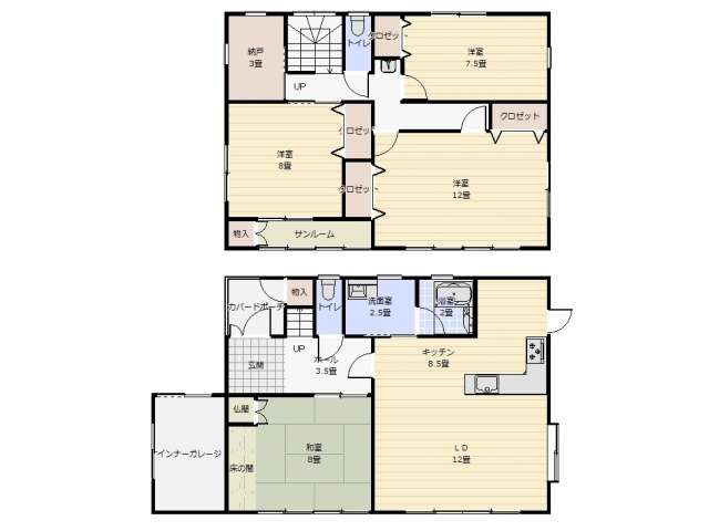 | 詳細間取 | 4LDK (1階:和8帖×1、1階:洋12帖×1、1階:洋7.5帖×1、1階:洋8帖×1、LDK20.5帖、サンルーム2帖) | ||